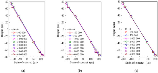 Figure 16 shows the distributions of concrete strain at different measuring points when the maximum static load was applied. The distribution of each measuring point remains linear during the whole process of the test, which is consistent with the assumption of plane section [38].