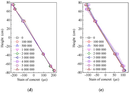 Distribution of concrete strain along height: (a) section A-A; (b) section B-B; (c) section C-C; (d) section D-D; (e) section E-E.