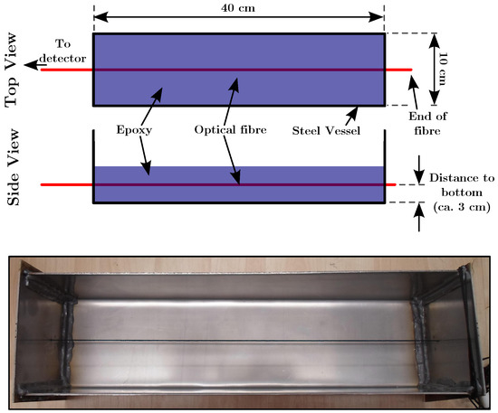Upper image: schematical image of the experimental setup. Lower image: photo of the steel mold built to hold the epoxy during the experiment. The black thread visualizes the position of the optical fiber. The thread was replaced by the optical fiber before epoxy was cast into the container.