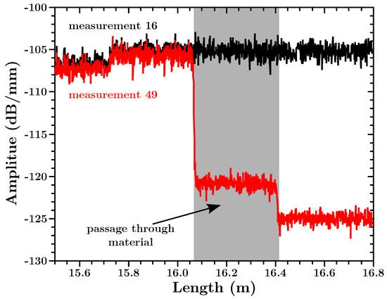 The black curve in Figure 5 shows the backscatter amplitude signal of Measurement 16. As described in Section 5.1, the fiber at this time is still surrounded by liquid epoxy. Thus, it does not experience microbending, and within the borders of natural signal variations the backscatter amplitude signal is a straight line, not exhibiting any signs of a deteriorating amplitude (the step at ca. 15.7 m is due to the splice of the measurement fiber to an extension fiber, which is connected to the OBR instrument). The backscatter amplitude signal for Measurement 49 (red curve in Figure 2), however, shows a step structure, and the amplitude decrease can clearly be attributed to the passage of the fiber through the hardening and shrinking material. Within the material, the amplitude stays constant.