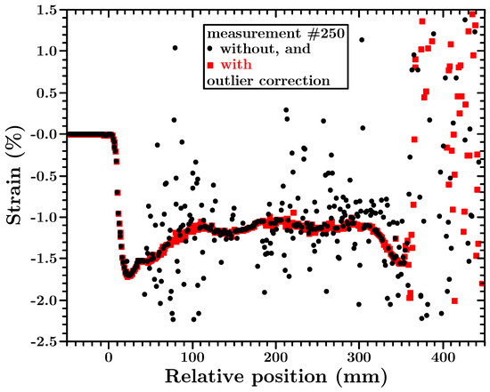 The running reference method cannot avoid shot noise, in contrast to the procedural noise of the traditional method. Hence, data retrieved by the running reference method still contain outliers (as defined, e.g., by Grubbs in [52]: “An outlying observation, or ‘outlier’, is one that appears to deviate markedly from other members of the sample in which it occurs.” The sample for which the comparison takes place may be locally defined (cf. Appendix A).). Since the data are added up to get the absolute strain status for each measurement, an outlier in one measurement will be carried through all the subsequent absolute strain values. This can be seen in Figure 3. The two outliers in Measurement Number 21 at a position of ca. 310 mm can also be seen at the same position in Measurement Number 35, but not in Measurement Number 16. In this case, the original outlier was in the data for Measurement Number 18 (not shown). To illustrate this issue better, in Figure 6, the absolute strain data obtained by the running reference method for Measurement Number 250 can be seen.