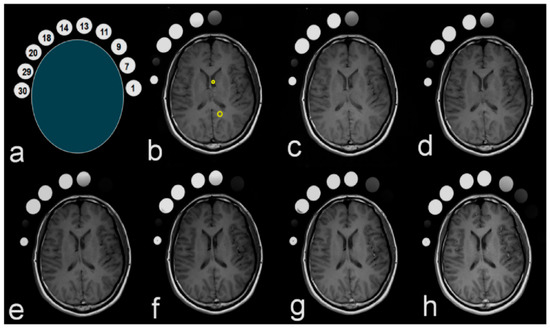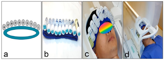 The clinical study was conducted on one healthy volunteer. For the clinical study, a clinical phantom was constructed according to Figure 3a,b. The purpose of the clinical phantom was to treat each container as a lesion, and to provide a direct comparison of the change in signal by GBCA dilution rate with the SI of the brain tissue. To this end, 10 containers, each containing a different concentration of GBCA, were attached to a non-magnetic headband; the containers used were containers 1, 7, 9, 11, 13, 14, 18, 20, 29, and 30 from Table 1. As shown in Figure 3c,d, the headband was strapped to the volunteer’s head, and the contrast enhancement was compared, by concentration, with the actual brain images. The procedure for the clinical study was the same as with the phantom study. Since individual differences in the white and gray matter of the brain can cause differences in the signal for a given setting, we performed 20 scans on a single volunteer.