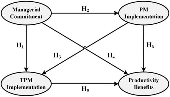 The goal of TPM is to maximize equipment effectiveness by continuously improving availability and preventing failures, but this cannot be achieved without managerial support [39] and employee involvement. Therefore, participation by all employees promotes a preventive maintenance approach based on motivation management and voluntary small group participation [40]. Also, TPM concepts entail a long-term commitment to planning, especially from senior managers, and usually initiates as a top-down exercise, but it can only be successfully implemented as “bottom-up” participation [7]. From this perspective, the operator commitment, performance, and morale reflect the managerial commitment to TPM [41]. In conclusion, managerial commitment is the most essential factor in TPM implementation [39], which is why the first hypothesis in this research can be proposed as follows: