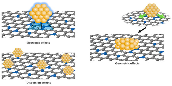 The influence on the catalytic activity and selectivity can be essentially ascribed to three effects: (i) electronic effects, (ii) geometric effects, and (iii) dispersion effects (Figure 1) [46]. Electronic effects originate from the difference between the Fermi level (EF) of the metal and that of the support, resulting in an electron transfer aimed to equalize the EF at the metal–support interface [49,50,51]. The lattice mismatch between the support and the metal NPs induces changes in the shape of the nanoparticle to optimize the interaction with the support [52]. Consequently, these geometric effects are combined with variations in the exposed crystallographic planes and in the coordination number of surface metal atoms, which affect the catalytic performances. Finally, functional groups can act as anchoring sites, promoting the nucleation of metal NPs, and then, the uniform dispersion on the support [53,54,55,56]. However, electronic, geometric, and dispersion effects are interrelated, and it is not possible to clearly discriminate each single contribution.