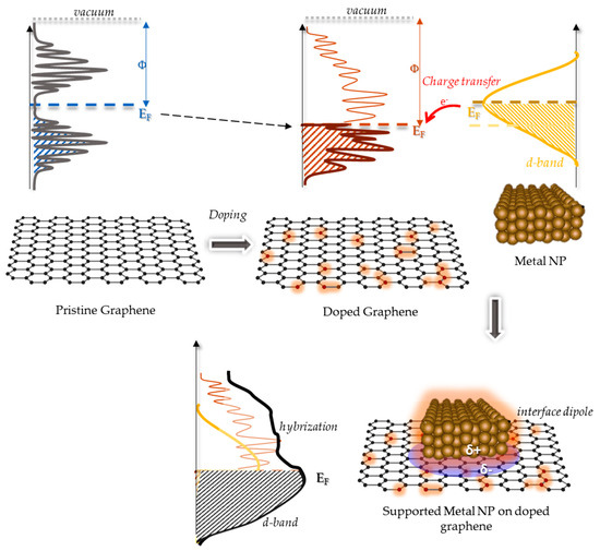 The position of the D-band is a fundamental parameter to describe the adsorption of molecules on metal surfaces, since it can be correlated with the adsorbate binding energy. However, this is not always true. Kim et al. [73] demonstrated that a direct correlation between the D-band center and the adsorption energy of H2 and CO is not applicable in the case of Pt nanoparticles supported on nitrogen-doped graphene. Otherwise, in these cases, an affordable correlation has been disclosed between the D-band center and the difference in the averaged adsorption energies between H2 and CO, ΔEad = Ead(CO) − Ead(H2). Authors also reported the weakened adsorption strength on Pt NPs supported on doped graphene. This difference in adsorption energy was more pronounced for CO adsorption than H2, and it is a consequence of the strong metal–support interactions. The latter was also responsible for the bond rearrangement and change in the cluster morphology to maximize the contact with heteroatoms present on the support surfaces (Figure 5). In any case, the impact of metal–support interactions decreases as the particles become larger [57].