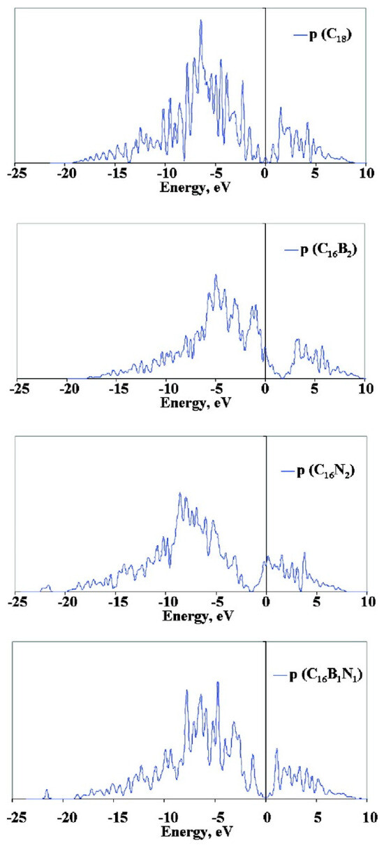 Acharya et al. [57] provided a deep insight into the adsorption of Pt and Ru atoms onto isolated B and N-doped graphene surfaces. C18, C16B2, and C16N2 were selected as the carbon structural models for the adsorption of metal species respectively on pristine, B-doped and N-doped graphene. In addition, the co-presence of boron and nitrogen (co-doping) with different connections (heteroatom–carbon or heteroatom–heteroatom bonds) was also investigated. According to DFT calculations, the incorporation of boron atoms in the graphene lattice produces a lowering of the Fermi energy (from −2.25 eV to −3.43 eV) and a consequent increase in the work function from 4.31 eV to 5.43 eV. Looking at the projected density of states (PDOS) for the p-orbital (Figure 3), a lower Fermi energy implies an augmented number of states (bonding and antibonding states) close to the Fermi energy and the appearance of more antibonding empty states above the Fermi level, which can help in minimizing the antibonding repulsions during the adsorption of metal species on the surface. In other words, a strong hybridization between the platinum d-orbitals and boron p-orbitals occurs. The essential consequence is the strengthening of the interaction between the B-doped surface and metal atoms.