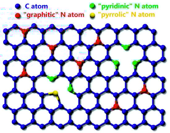 However, it is worth demonstrating that the coordination of nitrogen species in the carbon framework can determine the interaction of metal atoms with nitrogen-doped supports. Indeed, when a nitrogen atom replaces a carbon atom of graphitic plane, it will be bonded with three carbon neighbors, thus generating a so-called graphitic nitrogen: a sp2 nitrogen species. Nevertheless, graphitic nitrogen is not the unique species that can be created in an N-doped surface. The substitution of a carbon atom with nitrogen can occur according to almost three primary structural models differing in their nitrogen bonding configuration (Figure 4): pyridine-like (Npyr), pyrrole-like (NH), and graphitic (Ngr) [21]. Pyridinic nitrogen refers to sp2 two-fold coordinated nitrogen atoms contributing one p electron to the π-system. It could be incorporated as a vacancy (Nv) or as atom on an edge site (Ne). Nitrogen atom in pyrrole-like configuration is an sp3 coordinated (usually in a five-membered ring) species sharing two p electrons in the π system. Doping with pyridine-like, pyrrole-like, and graphitic nitrogen species impacts differently on the electronic band structure of graphitic carbon materials, having unavoidable implications for the interactions with adsorbates. The adsorption of single atoms of Pt-group metals on graphitic surfaces containing nitrogen species with different coordination has been modeled by DFT. The results from theoretical modeling unanimously identify the following ascending order of the binding energies of noble metals: N(graphitic) > N(pyrrolic) > N(pyridinic) [60,61,62].