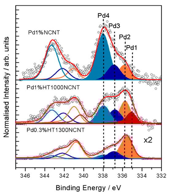 Arrigo et al. [60,77] proposed a convincing rationalization of the Pd 3d XPS signal of Pd NPs supported on nitrogen-doped carbon nanotubes. Four components were separated under the broad and complex Pd 3d signal (Figure 6). The signal at lower binding energy (Pd1, 335 eV) was attributed to bulk-like metallic palladium, and was associated with large Pd particles formed under drastic annealing conditions. The Pd2 signal (335.55−335.7 eV) accounted for metallic Pd nanoparticles electronically interacting with the carbon support. These species were predominant in the samples after calcination and reduction. The Pd3 signal (336.9 eV) was related to partially positive charged Pd atoms located at the interface, while the Pd4 component (337.8 eV) is generated by divalent Pd species, namely atomically dispersed Pd. The latter were stabilized by pyridinic nitrogen and possessed low reducibility. After annealing at 300 °C, Pd3 and Pd4 species evolved toward the formation of Pd2 species.