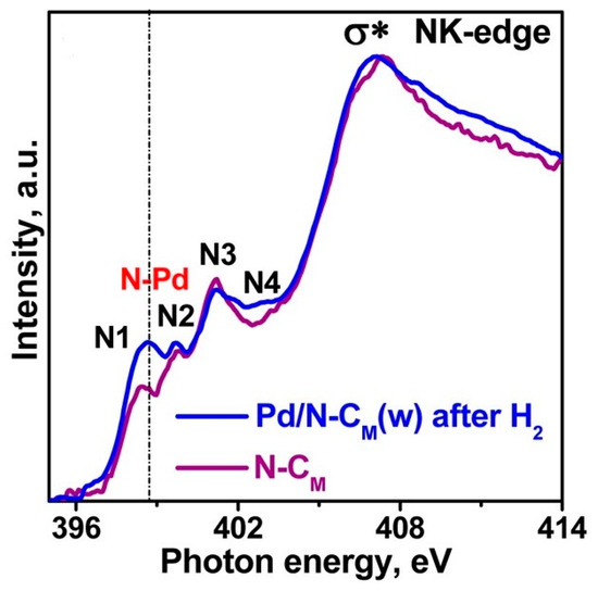 Nitrogen K-edge spectra is usually dominated by π*-transitions at 398.5 eV, 400 eV, and 401.4 eV, which can be credited to pyridinic, amino, and pyrrolic/graphitic type N-groups. The immobilization of metal on the surface on N-doped surfaces results in the decrease of the π* resonance intensity in N K-edge NEXAFS spectra (Figure 7). This evidence can be explained by invoking the Stöhr model: a metal–support π back-bonding interaction involves the N1σ–π* transition. Thus, a σ donor is formed by the lone pair orbital of the pyridine-like N, which is stabilized by the back-bonding of metal dπ–pπ orbitals with the N π* antibonding orbitals. Due to the enhanced bond strength, the metal dπ–pπ contributes in a greater extent to the π* orbital, thus producing the decrease of π* resonance intensity. In addition, a shoulder to the lower energy side of the π* resonance appears, indicating a charge localization on the N atom and a charge transfer between donor/acceptor sites [60].