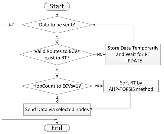 Figure 3 illustrates the data transmission procedure of a MCDM-ECP. In DAWNs, dynamic nodes may lose connection with their neighbors frequently, so nodes first check if there is a valid route to ECVs in the routing table (RT) before data transmission. Data will be stored temporarily until a valid route to the ECVs exists in the routing table. One hop to ECVs means that data can be directly transferred to ECVs; otherwise, the next-hop node should be chosen through the AHP-TOPSIS method. The MCDM-ECP algorithm is shown in Algorithm 1.