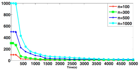 In this section, we make simulations for our proposed MCDM-ECP algorithm to evaluate the performance. To begin with, the weights matrix W should be settled (see Equations (1)–(5)). In practice, the weights of criteria are different according to the types of disasters. For example, it is essential for performances regarding the lifetime of ECNs in a devastating earthquake, since lots of trapped people need to be rescued as soon as possible without communications, while in a terrorist attack, the latency of ECNs is of great important for the government manipulating situations. There is clearly no influence for the selected weights matrix W to the final results, so we choose an earthquake scenario to settle the weights matrix W with: