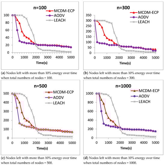 Figure 5 illustrates that the number of nodes left with more than 10% energy is decreasing with time in each protocol. At the beginning of emergency communication (0–2000 s), LEACH performs better than MCDM-ECP and AODV in energy consumption. This is because the cluster head selection process is not carried out frequently under LEACH protocol, since all of the nodes are fully charged at the beginning. After 2000 s, cluster heads selection simply relies on the energy left under LEACH protocol; there may be situations in which the nodes that are one or two hops away from ECVs still have to communicate with cluster heads, which may be far from ECVs. For MCDM-ECP, four criteria are considered to find probable next-hop; thus, it performs better in the long run.