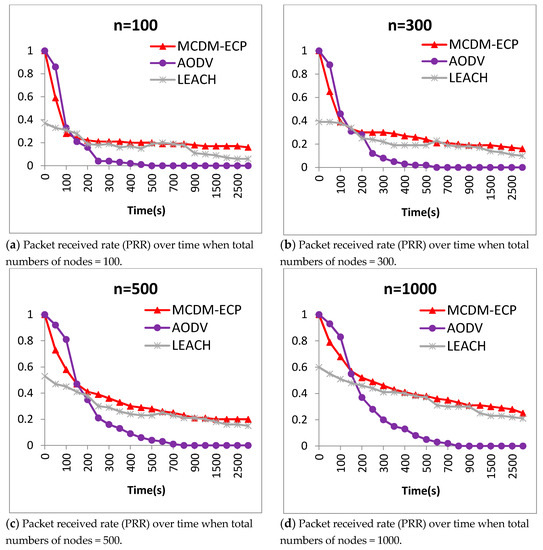It can be seen from Figure 6 that PRR does not perform well in our simulations because of the poor communication conditions. PRR drops with time under each protocol. AODV shows the best performance at the beginning of emergency communication (0–150 s) on PRR, which is because nodes can find destinations easily by multicasting their requests with AODV protocol. After 150 s, MCDM-ECP gains the highest PRR due to the multi-criteria method, while AODV performs the worst, since too much energy is consumed on multicasting requests. LEACH performs slightly worse than MCDM-ECP after 150 s, as the energy load is evenly distributed among the nodes in the network.