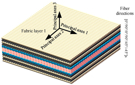 CFRP laminates can be regarded as an anisotropic multilayered structure [31,32]. Each layer of carbon-fiber fabrics is orthotropic and its elasticity modulus along the fiber direction is significantly higher than the elasticity modulus along other directions. The configuration of CFRP laminates is shown in Figure 2. The fabrics are placed with certain stacking sequences and can be described by their fiber directions as [θ1/θ2/···/θn]s, where the symbols in the square bracket indicate the stacking sequence and directions (angles in degree) of the carbon-fiber fabrics in CFRP laminates and the subscript s means symmetric arrangement. Each fabric layer has three principal axes represented by 1, 2 and 3. The principal axes 1 and 2 are both in the fabric layer, and the principal axis 1 is along the fiber direction. The principal axis 2 is perpendicular to the principal axis 1. The principal axis 3 is perpendicular to the fabric layer. There is no relative slip between two fabric layers for intact CFRP laminates.