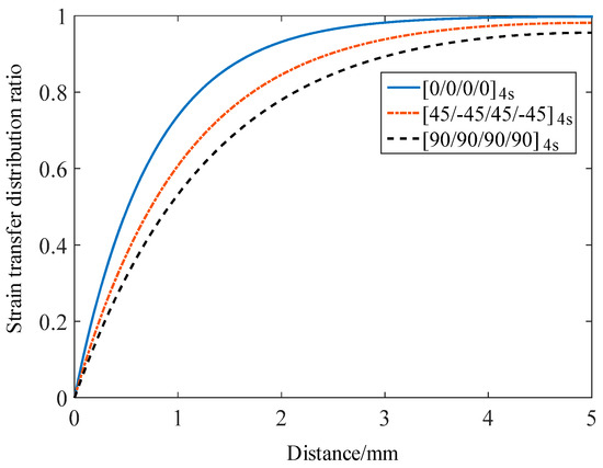 Strain transfer distribution ratio curves with stacking directions [0/0/0/0]4s, [45/−45/45/−45]4s, and [90/90/90/90]4s.