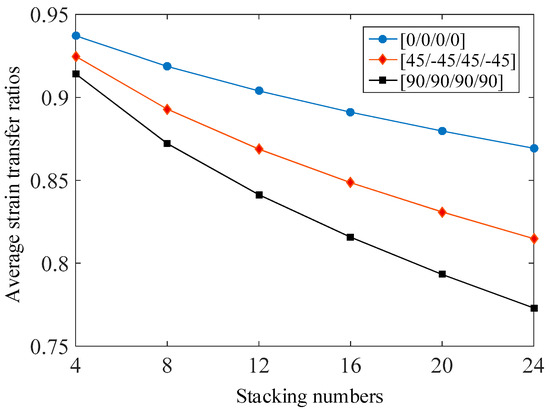 Average strain transfer ratios of stacking units [0/0/0/0], [45/−45/45/−45], and [90/90/90/90] under different stacking numbers.