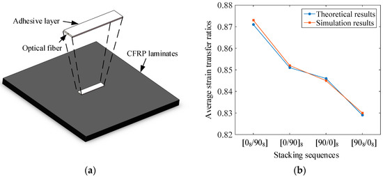 Stacking sequences describe the arrangement order of carbon-fiber fabric layers in CFRP laminates. To analyze the influence of the stacking sequences, the average strain transfer ratios of CFRP laminates [08/908], [0/90]8, [90/0]8, and [908/08] are calculated according to (21) and (24) as theoretical results, which are 87.1%, 85.1%, 84.6%, and 82.9%, respectively. The stacking numbers and stacking directions of the four CFRP laminates are the same. However, CFRP laminates whose 90° fabric layers are closer to the adhesive layer tend to have lower average strain transfer ratios. To verify the conclusion, the measurement structure was simulated in the ANSYS 15.0 software as shown in Figure 6a. The simulation parameters were set according to Table 1. The same strain value was applied to all of the four CFRP laminates by setting displacement boundary conditions. The average strain transfer ratios according to the simulation analysis are obtained as simulation results. The simulation results are 87.3%, 85.2%, 84.5%, and 83.0% for CFRP laminates [08/908], [0/90]8, [90/0]8, and [908/08], respectively. The average strain transfer ratios according to both the theory model and the simulation analysis are shown in Figure 6b. The errors between theoretical results and simulation results are less than 0.3%, which indicates a good consistency.
