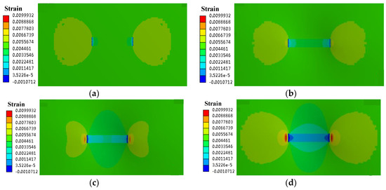 Simulation results of measurement structures with different stacking sequences. (a) Strain field for stacking sequence [08/908]; (b) Strain field for stacking sequence [0/90]8; (c) Strain field for stacking sequence [90/0]8; (d) Strain field for stacking sequence [908/08].