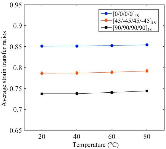 CFRP laminates [0/0/0/0]4s, [45/−45/45/−45]4s, and [90/90/90/90]4s are used for the calculation, and their average strain transfer ratios at different temperatures are shown in Figure 8. It indicates that the average strain transfer ratio of CFRP laminates [0/0/0/0]4s is the highest while the average strain transfer ratio of CFRP laminates [90/90/90/90]4s is the lowest at each temperature. With temperature rising from 20 °C to 80 °C, average strain transfer ratios enhance from 85.07% to 85.41%, from 78.63%to 79.16%, and from 73.74% to 74.40% for CFRP laminates [0/0/0/0]4s, [45/−45/45/−45]4s, and [90/90/90/90]4s, respectively. The values of elastic modulus and shear modulus decrease with temperature increasing. As the modulus of the silica core declines more than that of other three materials according to Table 2, the optical fiber is relatively more ductile at a higher temperature, which is beneficial to the strain transfer. Therefore, temperature can affect the strain transfer ratio by changing the elastic modulus. Besides, since the thermal expansion coefficients of silica core, coating, adhesive layer, and CFRP laminates are different, the temperature changes can generate residual stress in the measurement structure, which will cause the distortion of FBG sensor spectra [18]. To avoid this, the installation of FBG sensors and their strain measurement experiments should be kept in the same temperature environment.