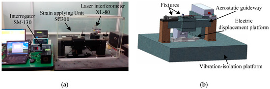 A strain transfer experiment was conducted to verify the accuracy of the strain transfer model. The experiment was carried out on a nondestructive tensile system. The system contains three basic instruments, which are the strain applying unit SC300 (Zolix Instruments Co., Ltd., Beijing, China), the laser interferometer XL-80 (Renishaw plc, Wotton-under-Edge, UK) and the interrogator SM-130 (Micron Optics, Inc., Atlanta, USA) as shown in Figure 9a.