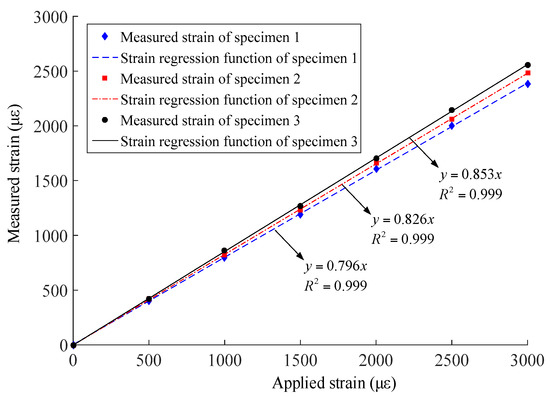 In the experiment, the applied strain εm was set to be 500 με, 1000 με, 1500 με, 2000 με, 2500 με, and 3000 με by changing moving distances of the fixture. The experiment was conducted with the specimens 1, 2, and 3. Three samples of each kind of specimen were used to repeat the experiment. The strain of the three samples was sensed by the FBG sensors, and the influence of temperature changes was compensated as described in Section 3.4. The average value of the strain recorded by the sensors under the same moving distance was regarded as corresponding measured strain εs to reduce random errors. The relationship between the measured strain εs and the applied strain εm is shown in Figure 11. The experimental data of the three stacking sequences were fitted by the linear regression functions. All the regression correlation coefficients R2 are more than 0.99, which indicates a good linear relationship between the measured strain εs and the applied strain εm. The slopes of the linear regression functions indicate average strain transfer ratios. They are 79.6% for specimen 1, 82.6% for specimen 2, and 85.3% for specimen 3. The experimental results illustrate that average strain transfer ratios are inconsistent for CFRP laminates with different stacking sequences. The theoretical average strain transfer ratios for specimen 1, specimen 2, and specimen 3 are 80.0%, 82.3%, and 84.9%, respectively. The maximum error between the theoretical and experimental results is less than 0.5%. This demonstrates that the theoretical results are coincident with experimental results for all the three stacking sequences. Therefore, the accuracy of the proposed strain transfer model can be verified.