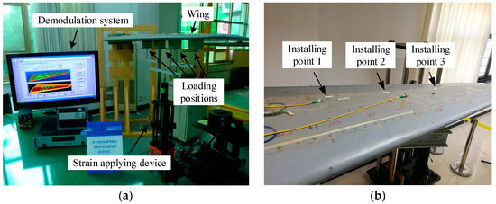 The strain testing of aviation structures is very important for aircraft design and manufacture. Another strain measurement experiment was conducted on the aircraft wing skin made of CFRP laminates to verify the practicality of the proposed strain transfer model. The wing was fixed on a static steel frame as shown in Figure 12a. To simulate the deformation of the wing in flight, four loading positions were evenly distributed on the lower surface of the wing. The loading positions were connected to a tensile tester with a two-stage transmission mechanism. The force at each loading position is a quarter of the total loading force applied by the tensile tester. Thus, the deformation of the wing can be controlled by changing the loading force of the tensile tester. FBG sensors 1, 2, and 3 were respectively bonded to the installing points 1, 2, and 3 on the surface of the wing skin as shown in Figure 12b. The stacking sequences of the CFRP laminates at the installing points are same as the stacking sequences of the three specimens in Section 4.1, and 3 FBG sensors were respectively bonded to the specimens 1, 2, and 3 as temperature compensation sensors. The geometrical and mechanical parameters of the adhesive layer and optical fiber are shown in Table 1. The protective paint at the installing points was removed to improve the measurement accuracy. The wavelength of all the FBG sensors is 1550 nm, and the wavelength shifts were detected by interrogator SM-130. The loading force was set to 2000 N, 4000 N, 6000 N, 8000 N, and 10000 N. The measured strain obtained by FBG sensors 1, 2, and 3 was recorded. According to Section 4.1, the measured strain of FBG sensors 1, 2, and 3 was compensated based on the theoretical average strain transfer ratios 80.0%, 82.3%, and 84.9%, respectively.