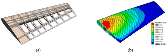 Aircraft wing finite element simulation. (a) Aircraft wing 3D model; (b) Strain field of the wing skin.