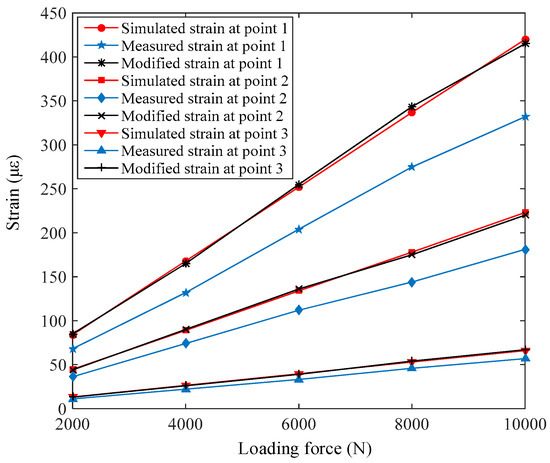 Comparison among measured strain, modified strain, and simulated strain at the three installing points.