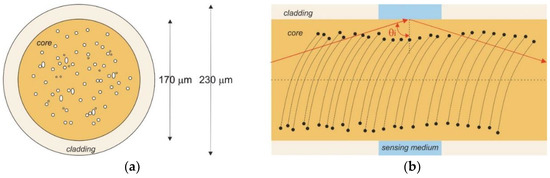 The LDF chosen as the host platform (Fibrance® by Corning®, New York, NY, USA) is composed of a silica core with a diameter of , and a low-index polymeric cladding with a diameter of [15] (see Figure 1a). In the chosen LDF, the guided light is scattered radially outward through a plurality of helical voids randomly distributed in the core, and wrapped around the long axis of the optical fiber (see Figure 1b). The pitch of the helical voids controls the amount of the side-emitted light, with smaller pitches scattering more light than larger pitches, while their diameter ranges in size from 50–500 nm; consequently, they scatter the propagating light almost independently of the wavelength of light used [15].