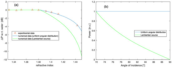 From Figure 3, however, we see that the loss computed under the Lambertian source assumption does not match the experimentally observed behavior. Instead, an excellent agreement is found if assuming a perfectly scrambled angular distribution ( in Equation (1)). This finding is reasonable considering the scrambling of optical energy operated by the helical voids running along the core. To best illustrate this point, we compare in Figure 3b the angular distribution of power as expressed by Equation (2) (Lambertian source) with the one speculated for our LDF. It can be seen that, in the case of the Lambertian source, the power density of rays is higher near the critical angle ( in our case), therefore the loss of TIR for these rays, consequent to the increase of the SRI, has a greater impact on the transmitted power. Instead, for the scrambled, non-Lambertian case, power is equally distributed among the various angles; therefore, the relative weight of rays escaping away due to loss of TIR is lower.
