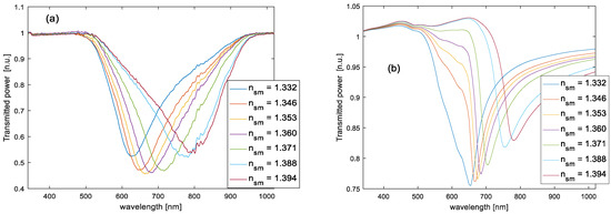 After this preliminary study, we have used the SPR-based LDF sensor configuration. Figure 4a shows the experimental spectral transmission of our sensor, normalized to the spectrum recorded with air as the surrounding medium, for different water–glycerol solutions. A clear red-shift of the resonance wavelength (SPR dip) is observed when increasing the RI of the sensing medium. For comparison purposes, in Figure 4b we show the corresponding spectra obtained by using the same model previously described (Equation (1) with ), with the only difference that reflectance coefficients are now calculated taking into account the metal film.