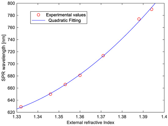 Finally, Figure 5 shows the experimentally obtained resonance wavelength versus the SRI, together with the results of a quadratic fitting. From Figure 5, we see that the sensitivity is not constant, increasing from ≈1500 to ≈4000 nm/RIU in the analyzed range.