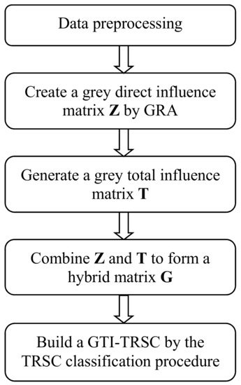 The higher the value of tij, the more likely it is that xj can be included in GTI-TC(xi). The lower (X) and upper approximations (X) of X can be determined by subset and concept approximations by replacing , , and TC(x) with , , and GTI-TC(x), respectively. ⟨X, X⟩ is called a GTI-TRS. As shown in Figure 1, by finding the grey total influence, the proposed GTI-TRSC can be set up by merging the proposed classifier with the computational steps of the TRSC.