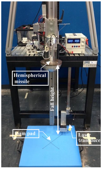 According to the ASTM F1292 standard [11], a hemispherical missile with 160 mm diameter and a mass of 4.6 kg, equipped with 500 g uniaxial accelerometer, was dropped from a height (through a guidance system) on the foam pad, which was fixed by an adhesive tape on a steel anvil. In each test the fall height of the missile was measured by a laser displacement sensor located close to the missile release mechanism. A second laser displacement sensor, positioned near the specimen surface and triggered by the missile position, was used to measure the missile velocity just before impacting on the foam pad.