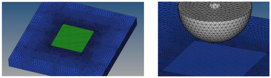 To generate the nodes grid and the background mesh, the pads were divided into two distinct volumes and different node spacing was adopted for each volume. The first volume is the “impact zone,” which has a prismatic shape with a base of size 200 mm × 200 mm, a height equal to the pad thickness, and includes the foam material more severely deformed by the missile actions (Figure 3). This volume was meshed with small hexahedral elements having edge size equal to 5 mm. The remaining portion of the pad was instead discretized with tetrahedral elements having a gradually increasing size from 5 mm at the inner boundary to around 10 mm at the external edges of the pad.