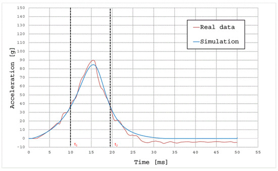 In Figure 5, the simulated and experimental acceleration vs. time curves of the hemispherical missile impacting the EVA foam 50 mm at the velocity of 4.5 m/s are compared. In all the examined cases, to validate the numerical model using the statistical indexes RMSE and R2, only the most relevant part of the acceleration curves is used. More specifically, only the acceleration values belonging to the time range [ti, tf] derived from the algorithm used to calculate the HIC index were considered. Actually, this is the most injurious portion of the impact waveform, where the acceleration reached the highest values.