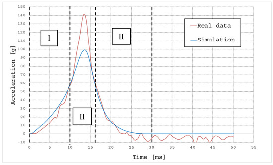 Further analysis was conducted for the EVA mat 50 mm at the impact test velocity of 5.2 m/s. In this case, the comparison between the simulated and real acceleration curves was carried out separately for the initial, central, and final regions of the diagram shown in Figure 7.