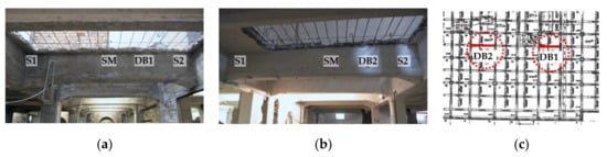 Beams DB1 (a) and DB2 (b) in the RC building at the basement floor (c).