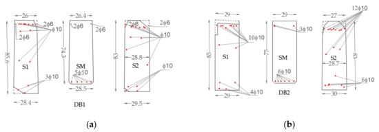 Beams DB1 (a) and DB2 (b); concrete geometries and steel reinforcement configuration for the sections at the beam ends (S1, S2) and at the beam midspan (SM); rebar diameter [mm]; concrete geometries [cm].