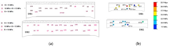 Beams DB1 and DB2: cubic concrete compressive strength values (R) along the beams obtained by (a) the corrected non-destructive tests at U test stations or (b) by destructive tests on concrete cores (ST).