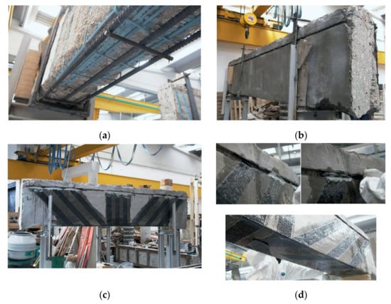 These research studies were usually performed on beams purposely built in the lab to be retrofitted and tested, that did not present material deterioration phenomena (corrosion of rebar, concrete carbonatation or surface peeling) [,], poor concrete quality, improper reinforcement detail and uncertainties about steel and concrete mechanical characteristics and rebar configuration typical of “real” old RC structures [,]. For that reason, the experimental tests are necessary to evaluate the shear strength, the failure mode, and the strain of the FRP reinforcement for “real” beams.