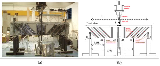 The three-point loading test was carried out applying a vertical load (F) at the beam midspan by means of a 1000 kN hydraulic actuator supported by a vertical steel frame. This force produced two vertical reactions at the two beam supports. Vertical steel plates were added at the supports to avoid the beam torsion and lead plates regularized the contact surface between the beam intrados and the steel supports (Figure 5a). The apparatus setup is shown in Figure 5b and measured: the applied vertical load of a 1000 kN load cell placed between the actuator and a thick steel plate on the beam extrados at the midspan; the vertical deformations of each beam support by two vertical potentiometers (one for each beam side); the vertical beam deflections by 4 potentiometers at 0.25 L, 0.5 L (2 at the beam midspan) and 0.75 L for each beam side; 3 diagonal displacements along the potential shear cracks by 3 potentiometers for each beam side at each beam end (Figure 5b); the local axial strains of the CFRP fabric at bottom, middle and top position along each U-strip side at each beam end. The beams deflections measured along each beam were corrected considering the vertical deformations at the supports.