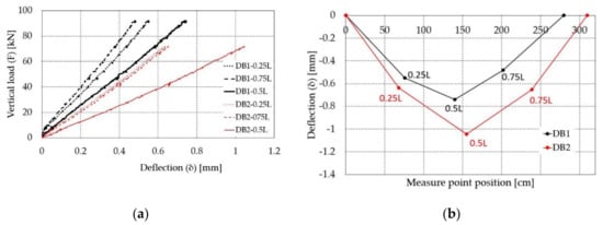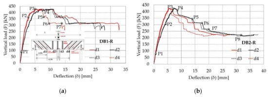 Beam deflections (δ) were measured at 0.25 L, 0.75 L and at two points near 0.5 L (Figure 5b) during the application of the vertical load (F). The vertical load-deflection curves are given for each measurement point in Figure 7a,b. Deflection at each point was calculated as the mean value of measurements taken on both sides of beam (§4.1). The deflection d1 and d4 were measured at 0.25 L and 0.75 L whereas the deflections d2 and d3 were taken at the point on the left and the one on the right of the midspan (0.5 L) (Figure 7a). The maximum vertical load values at failure were 427.5 kN and 425.5 kN for the beams DB1-R and DB2-R and the corresponding midspan deflection values were 6.48 mm and 7.25 mm.