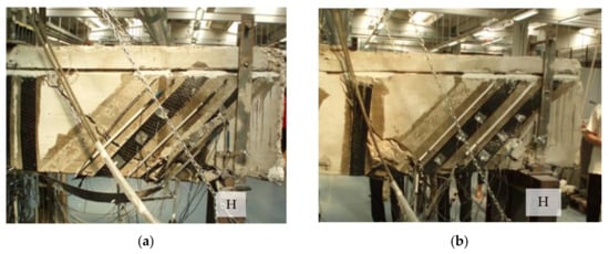 The beam DB2-R behaved similarly to DB1-R (Figure 7a,b): shear failure started near the H hinge support with a first wide diagonal crack at about a quarter of the beam span and a second diagonal crack near the H support (Figure 8b). The shear failure of DB2-R occurred at about the same load value measured for the beam DB1-R, but the failure mode was different because the anchorages of the new bottom longitudinal rebars were extended over the supports of the beam DB2-R. This longer rebar anchorage anchored better the new rebars with respect to the one in the beam DB1-R. The new bottom reinforcement gave a better contribution to resist the force due to the shear at support and therefore the shear cracks moved toward the beam midspan (the crack located at about a quarter of the beam span from the support H).