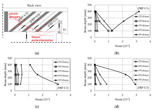 Strains of the CFRP U-strips were monitored during the beam failure test by means of three strain gauges at bottom, middle and top position along each U-strip side (Figure 9a). In Figure 9, the strains measured by the strain gauges on the diagonal CFRP strips FRP-U1, FRP-U2 and FRP-U3 (Figure 9b–d) near the support H of the DB1-R beam are plotted for five different values of the vertical load (F). These five load values are smaller than the maximum vertical load (Fmax) applied on the beam and are: F = 0.25Fmax (107 kN), the load that produced the beam flexural cracking (F =0.24Fmax, on average from the literature); F = 0.50Fmax (212 kN); F = 2/3Fmax (285 kN), that usually corresponds to the onset of strips debonding [,]; F = 0.85Fmax (360 kN) and F = 0.95Fmax (400 kN). The strains measured at Fmax (425 kN) are not included in Figure 9 because the strips detached from the beam surface and so the strain gauge measurement is not interesting at complete debonding of strips. The strains measured before complete debonding for F = 0.95Fmax were about equal to 0.3% (Figure 9b–d).