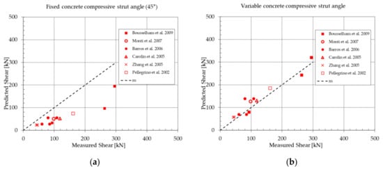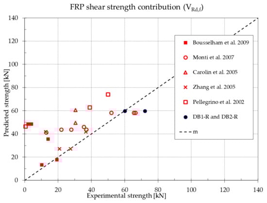 Regarding the first issue, the experimental results have shown that not all steel stirrups crossed by shear cracks yield [,,,,,,,,,,], and so the steel shear reinforcement contribution may not be fully mobilized [] especially in the case of FRP reinforcement debonding. For that reason, the shear strength value predicted by well-known models may be not safe [,,].