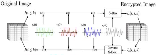 We propose to use four chaotic systems. The first three systems form a three-dimensional crossed chaotic signal, and they are used to introduce diffusion in the result. They are simulated for iterations. The forth chaotic system is used to creating a Substitution Box (S-Box) [], we use the generation algorithm proposed in []. S-boxes are used for introducing confusion in the encryption and is a common technique applied in AES and other block ciphers [].
