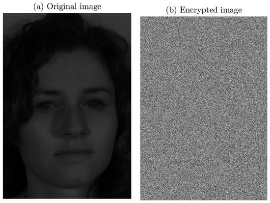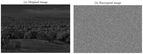 The idea of chaotic encryption is that using the chaotic behavior no algorithm could differentiate between an encrypted image and image full of random pixel values. A common technique in cryptanalysis is the differential attack, where we encrypt two different images with the same cipher. If the encrypted images are statistically different, then we could infer information about the cipher secret key or parameters. In [], two statistical measures are proposed to verify if cipher algorithm is weak against differential attack. The Number of Changing Pixel Rate (NPCR) is defined in Equation (3), where T is the total of pixels in the images and is defined in (2), where and are two different images and c is a cipher algorithm.