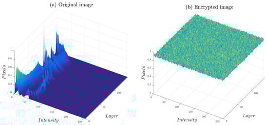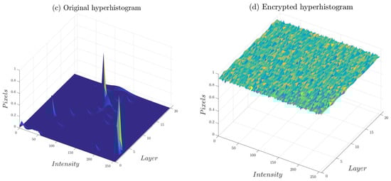 We also show in Figure 6, the normalized hyperhistogram where we calculate the histogram of every layer. Please note that the encrypted image has a hyperhistogram approximately uniform.
