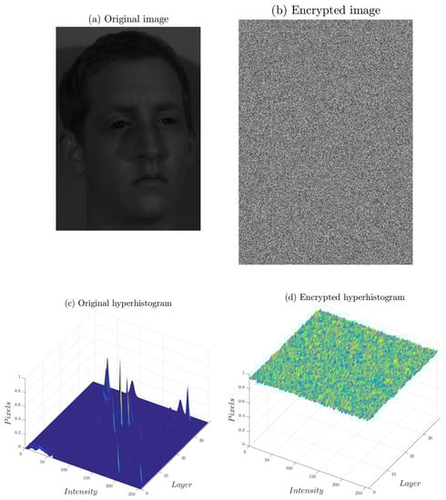 To measure the performance of the image chaotic encryption algorithms is common to use the information entropy defined in (1), where is the intensity of the pixel i of the image, is the probability of intensity to appear. The is the larger number represented in the data (255 for image intensity values), then the maximum theoretical value of entropy for the image of 256 intensity values is 8. Encrypted data that have a value of entropy close to the theoretical maximum is difficult to differentiate from random data, consequently it is secure against cypher-text-only attacks.